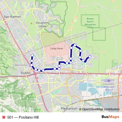 The first stop of the 501 bus route is Positano Pkwy & Valentano Dr Wb and the last stop is DHS - Village Pkwy & Davona Dr. 501 (Positano Hill) is operational during entre semana.