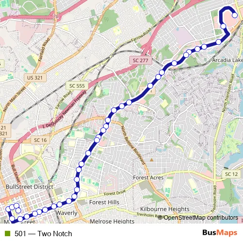 Services on the 501 - Two Notch bus stop at 22:10 on lunes, martes, miércoles, jueves, viernes, sábado, domingo.