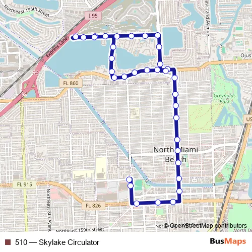 The first stop of the 510 bus route is NE 167th ST @ NE 15 Ave and the last stop is NE 185 ST & 18 Av. 510 (Skylake Circulator) is operational during todos los días.