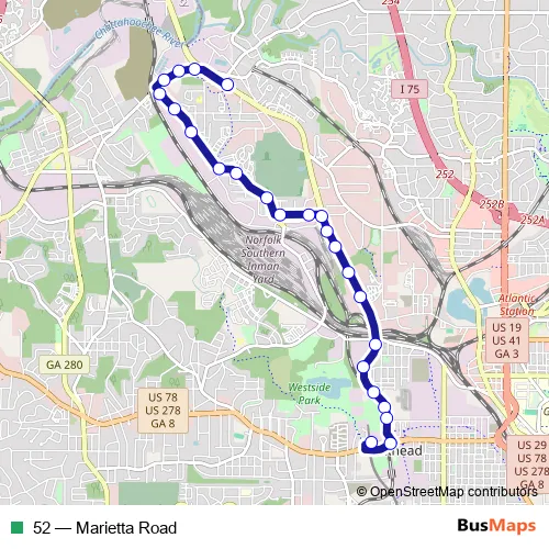 The first stop of the 52 bus route is Marietta Blvd NW @ Moores Mill RD Nw and the last stop is
