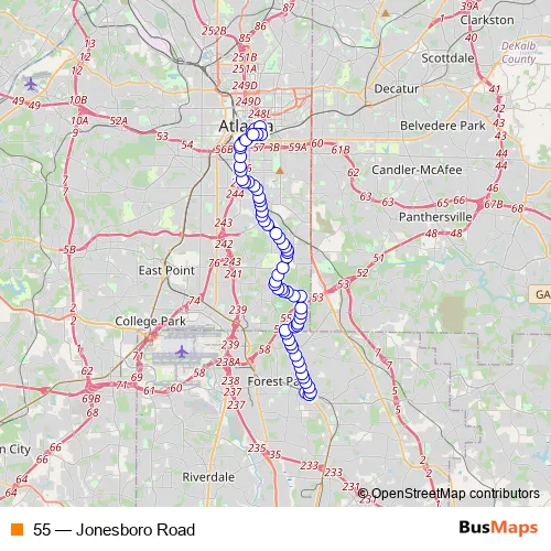 See why over 2 million users trust and consider busmaps.com as the best public transport website. busmaps gives you Atlanta Buses suggested routes, real-time bus tracker, line route maps in Atlanta, and helps to find the closest 55 bus stops near you. No internet available? Download an offline PDF map and bus schedule for the 55 bus to take on your trip.