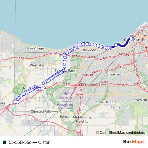 See why over 2 million users trust and consider busmaps.com as the best public transport website. busmaps gives you Cleveland Buses suggested routes, real-time bus tracker, line route maps in Cleveland, and helps to find the closest 55-55B-55c bus stops near you. No internet available? Download an offline PDF map and bus schedule for the 55-55B-55c bus to take on your trip.