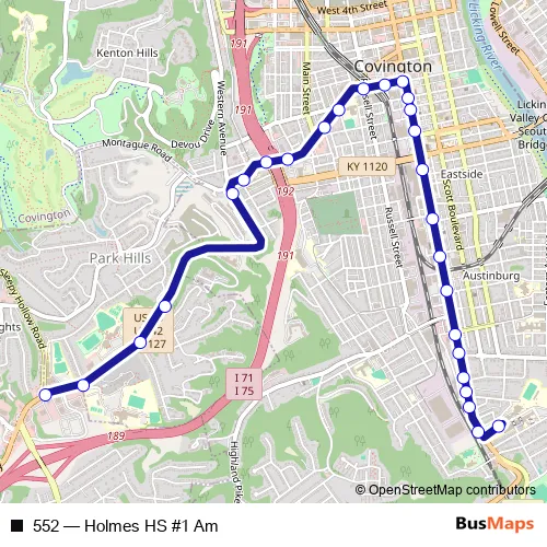 Services on the 552 - Holmes HS #1 Am bus stop at 07:50 on lunes, martes, miércoles, jueves, viernes.