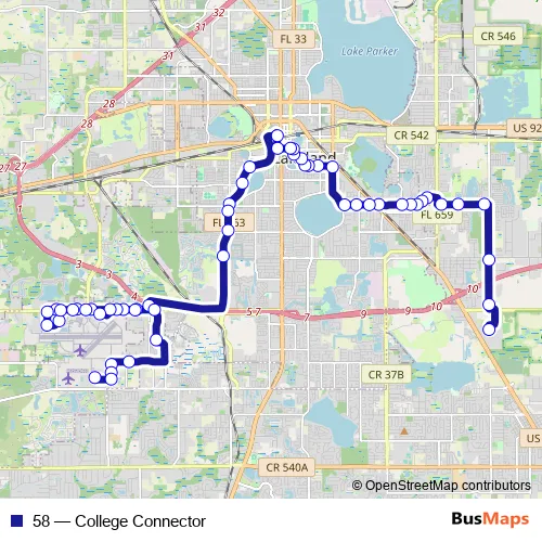 The first stop of the 58 bus route is Polk State College/Usf and the last stop is Polk State Corporate College. 58 (College Connector) is operational during entre semana.
