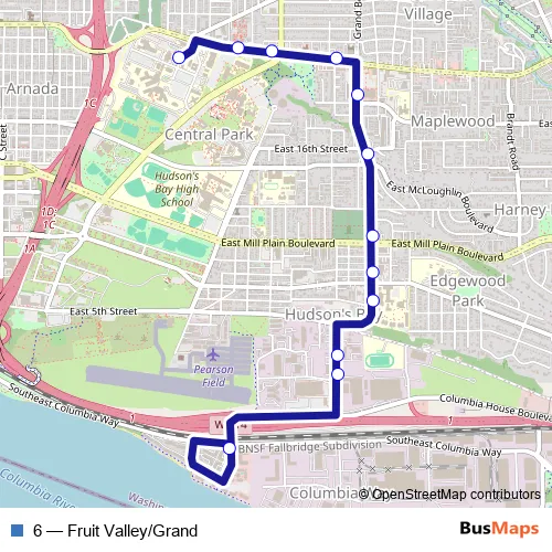 The first stop of the 6 bus route is Columbia Shores Blvd & Columbia Way and the last stop is VA Medical Center. 6 (Fruit Valley/Grand) is operational during todos los días.