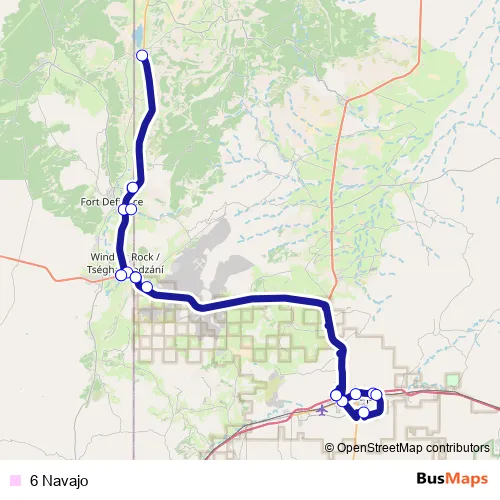 The first stop of the 6 Navajo bus route is Navajo Pine - Shopping Center and the last stop is