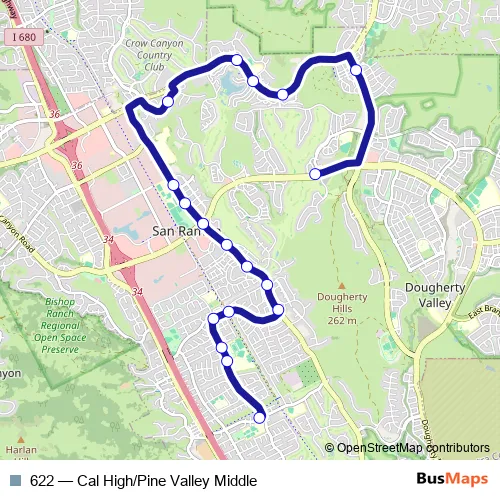 The first stop of the 622 bus route is Pine Valley Rd and Broadmoor Dr and the last stop is Bollinger Canyon Rd and Gale Ridge Rd. 622 (Cal High/Pine Valley Middle) is operational during todos los días.