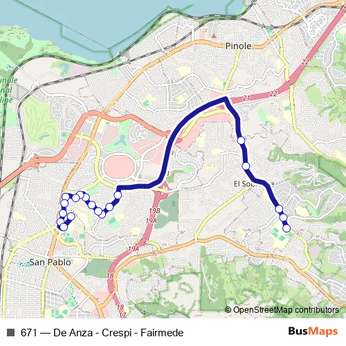 The first stop of the 671 bus route is De Anza High School and the last stop is Contra Costa College. 671 (De Anza - Crespi - Fairmede) is operational during entre semana.