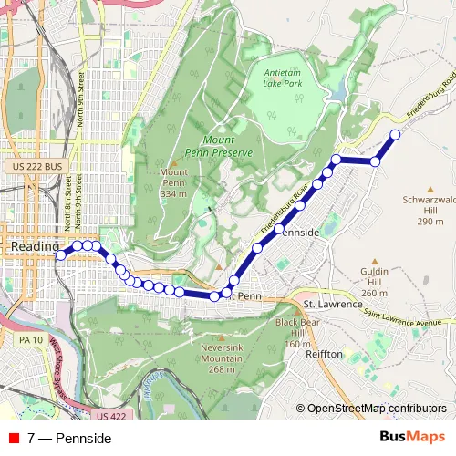 The first stop of the 7 bus route is Richard Delp(stony Creek) Town Houses and the last stop is Barta Transportation Center. 7 (Pennside) is operational during todos los días.