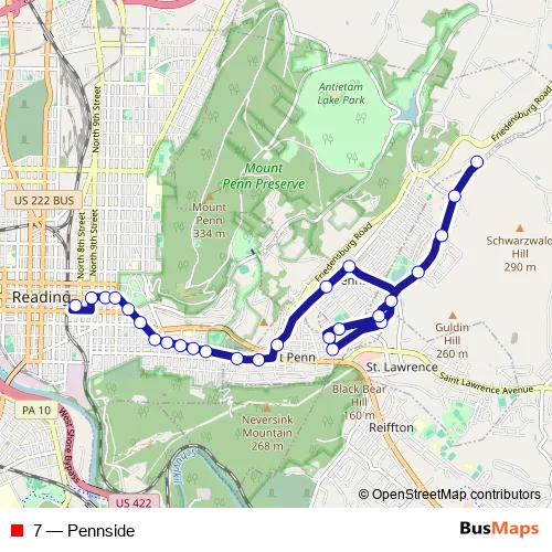 The first stop of the 7 bus route is Barta Transportation Center and the last stop is Richard Delp(stony Creek) Town Houses. 7 (Pennside) is operational during todos los días.
