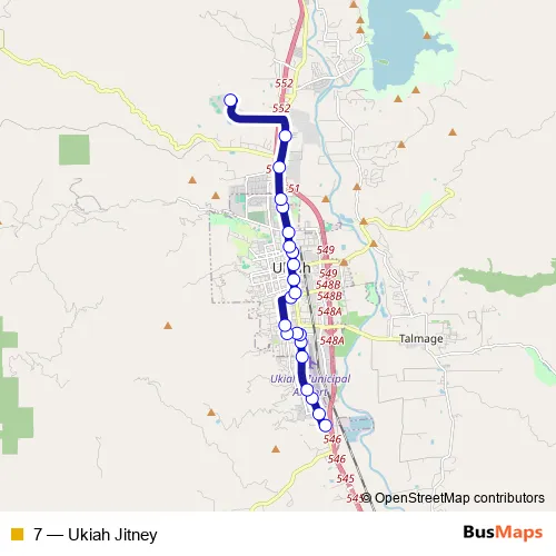 See why over 2 million users trust and consider busmaps.com as the best public transport website. busmaps gives you Ukiah Buses suggested routes, real-time bus tracker, line route maps in Ukiah, and helps to find the closest 7 bus stops near you. No internet available? Download an offline PDF map and bus schedule for the 7 bus to take on your trip.