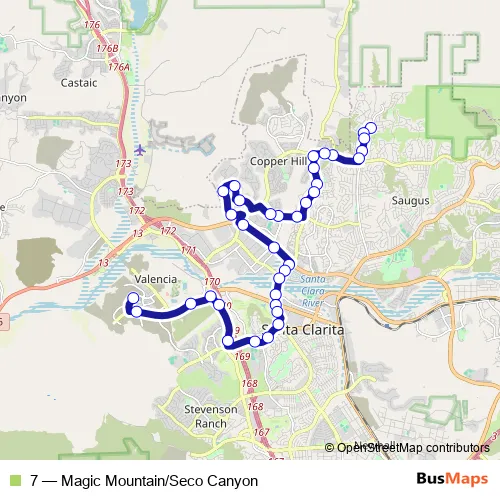 The first stop of the 7 bus route is Tamarack Ln & Seco Canyon Rd and the last stop is Middleton Street & Ramblewood Street. 7 (Magic Mountain/Seco Canyon) is operational during todos los días.