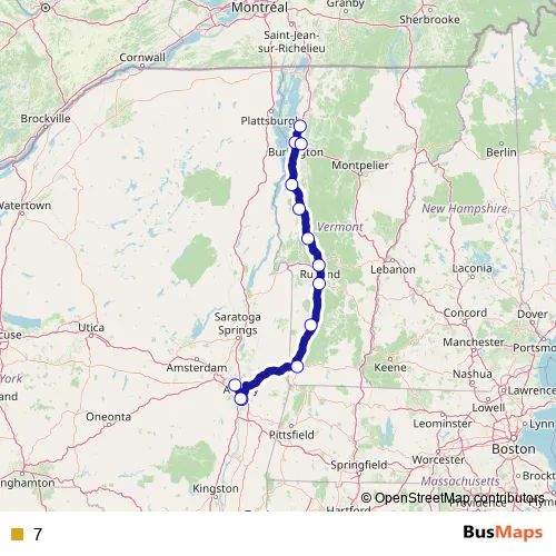 The first stop of the 7 bus route is Colchester, VT Park and Ride and the last stop is Albany International Airport. 7 is operational during todos los días.