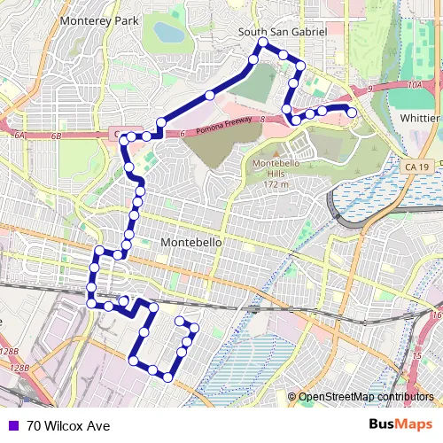 The first stop of the 70 Wilcox Ave bus route is Mines/Greenwood and the last stop is The Shops at Montebello -Robinsons May. 70 Wilcox Ave (70 Wilcox Ave) is operational during entre semana.