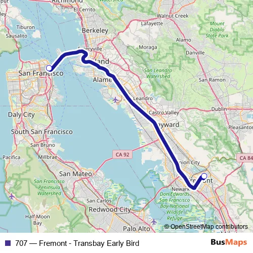 The first stop of the 707 bus route is Fremont Bart and the last stop is Salesforce Transit Center. 707 (Fremont - Transbay Early Bird) is operational during entre semana.