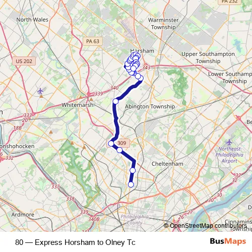 The first stop of the 80 bus route is Olney Transit Center - Rts 22 80 and the last stop is Blair Mill Rd & Welsh Rd - Mbns. 80 (Express Horsham to Olney Tc) is operational during entre semana.