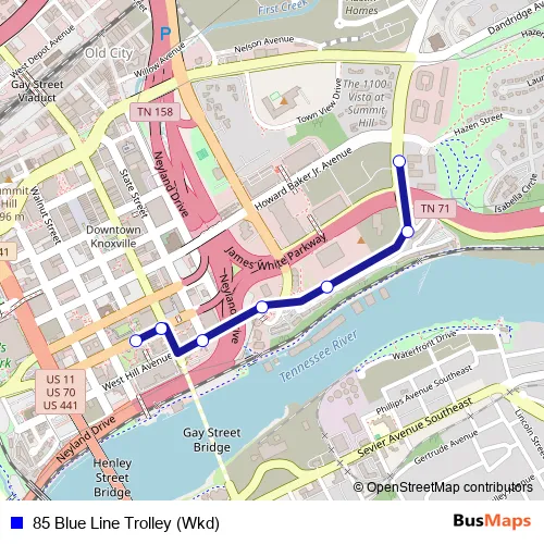 See why over 2 million users trust and consider busmaps.com as the best public transport website. busmaps gives you Knoxville Buses suggested routes, real-time bus tracker, line route maps in Knoxville, and helps to find the closest 85 Blue Line Trolley (Wkd) bus stops near you. No internet available? Download an offline PDF map and bus schedule for the 85 Blue Line Trolley (Wkd) bus to take on your trip.