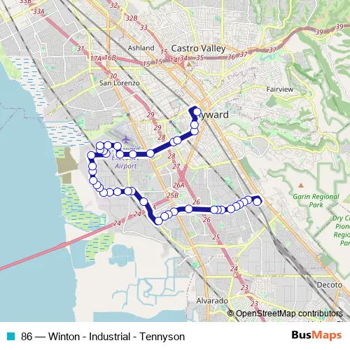 The first stop of the 86 bus route is South Hayward Bart and the last stop is Hayward Bart. 86 (Winton - Industrial - Tennyson) is operational during todos los días.