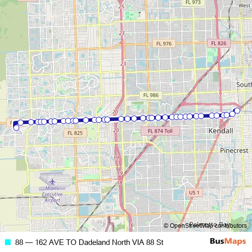 | SW 88 ST @ SW 133 St | 06:04 | 06:45 | 07:25 | 07:50 | 08:22 | 08:52 | 09:21 | 09:51 | 10:24 | 10:54 | 11:25 | 11:55 | 12:25 | 12:55 | 13:25 | 13:55 | 14:24 | 14:54 | 15:25 | 15:55 | 16:26 | 16:56 | 17:25 | 17:55 | 18:25 | 18:55 | 19:22 | 19:52 | 20:21 | 21:20 | 22:18 | 23:19 | 00:19 +1 | 01:25 +1 |