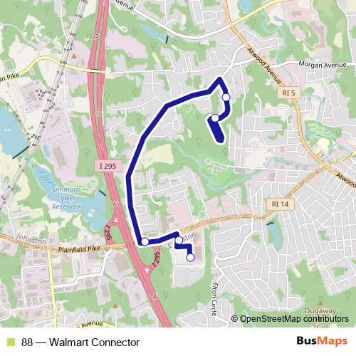 The first stop of the 88 bus route is Walmart (Cranston) and the last stop is Simmons Village. 88 (Walmart Connector) is operational during entre semana.