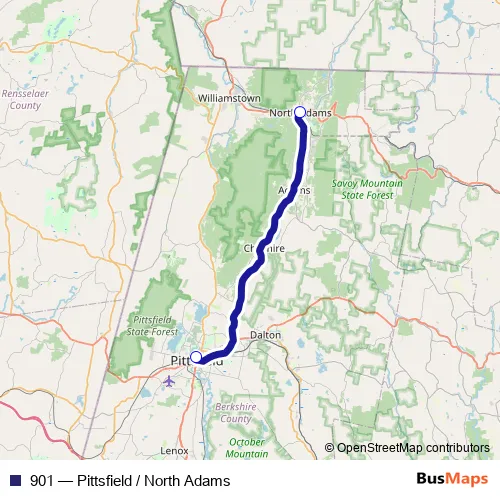 The first stop of the 901 bus route is Pittsfield Itc and the last stop is North Adams Center. 901 (Pittsfield / North Adams) is operational during entre semana.