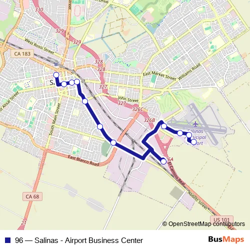 The first stop of the 96 bus route is Salinas Transit Center / Gate 8 and the last stop is Salinas Airport Business Park. 96 (Salinas - Airport Business Center) is operational during entre semana.