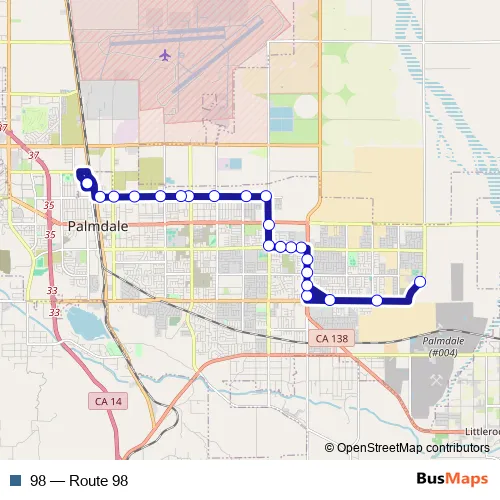 See why over 2 million users trust and consider busmaps.com as the best public transport website. busmaps gives you Palmdale Buses suggested routes, real-time bus tracker, line route maps in Palmdale, and helps to find the closest 98 bus stops near you. No internet available? Download an offline PDF map and bus schedule for the 98 bus to take on your trip.