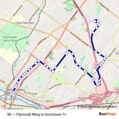 See why over 2 million users trust and consider busmaps.com as the best public transport website. busmaps gives you Norristown Buses suggested routes, real-time bus tracker, line route maps in Norristown, and helps to find the closest 98 bus stops near you. No internet available? Download an offline PDF map and bus schedule for the 98 bus to take on your trip.