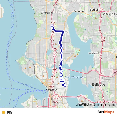 See why over 2 million users trust and consider busmaps.com as the best public transport website. busmaps gives you Seattle Buses suggested routes, real-time bus tracker, line route maps in Seattle, and helps to find the closest 988 bus stops near you. No internet available? Download an offline PDF map and bus schedule for the 988 bus to take on your trip.