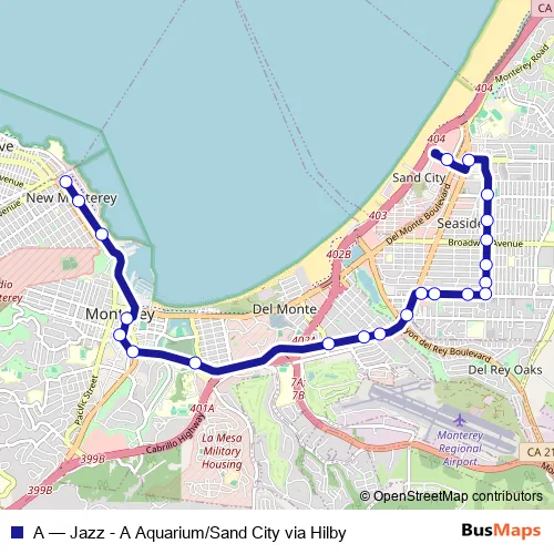 The first stop of the A bus route is Playa / Sand City Station and the last stop is Foam / Irving. A (Jazz - A Aquarium/Sand City via Hilby) is operational during todos los días.