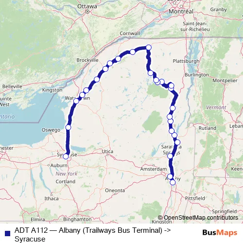 The first stop of the ADT A112 bus route is Albany (Trailways Bus Terminal) and the last stop is Syracuse. ADT A112 (Albany (Trailways Bus Terminal) -> Syracuse) is operational during todos los días.