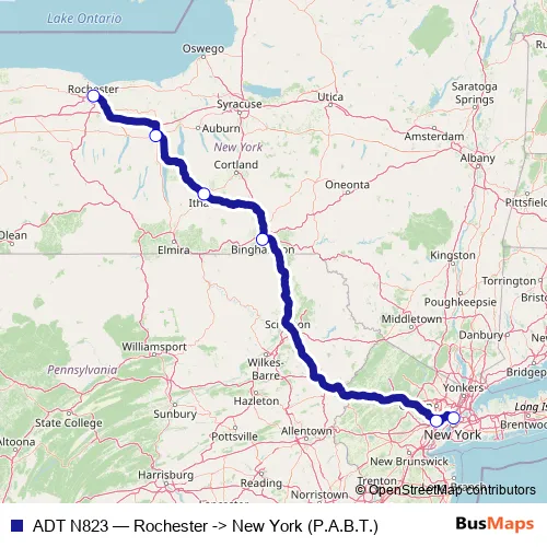 The first stop of the ADT N823 bus route is Rochester and the last stop is New York (P.A.B.T.). ADT N823 (Rochester -> New York (P.A.B.T.)) is operational during todos los días.