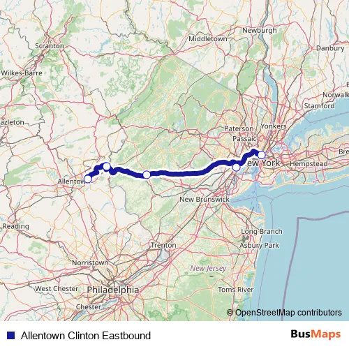 The first stop of the Allentown Clinton Eastbound bus route is Wind Creek Bethlehem and the last stop is New York, NY (Pabt). Allentown Clinton Eastbound (Allentown Clinton Eastbound) is operational during todos los días.