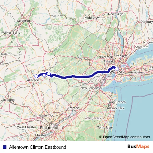 The first stop of the Allentown Clinton Eastbound bus route is New York, NY (Pabt) and the last stop is Lehigh Valley Intl Airport (Abe). Allentown Clinton Eastbound (Allentown Clinton Eastbound) is operational during entre semana.