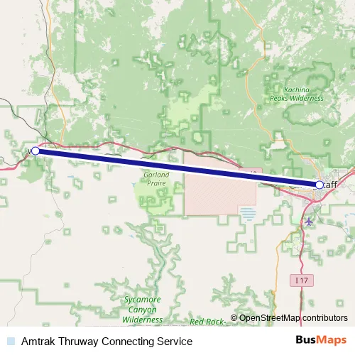 The first stop of the Amtrak Thruway Connecting Service bus route is Flagstaff and the last stop is Williams. Amtrak Thruway Connecting Service (Amtrak Thruway Connecting Service) is operational during todos los días.