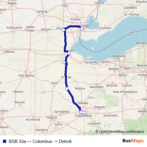 The first stop of the BSB 33a bus route is Columbus Bus Station and the last stop is Detroit. BSB 33a (Columbus -> Detroit) is operational during todos los días.