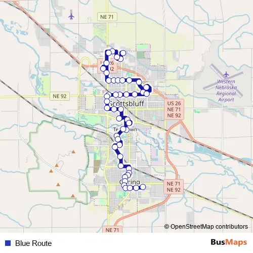 The first stop of the Blue Route bus route is Regional West Medical Center (Birth & Infant Care Center) and the last stop is L St. Blue Route is operational during entre semana.