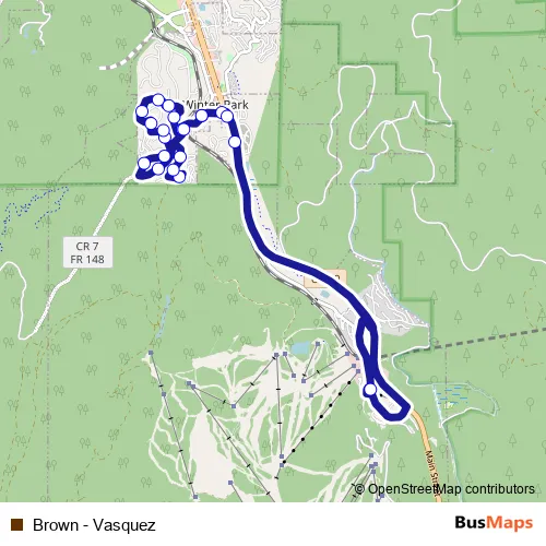 The first stop of the Brown - Vasquez bus route is Winter Park Resort and the last stop is Beaver Village Southbound. Brown - Vasquez (Brown - Vasquez) is operational during todos los días.