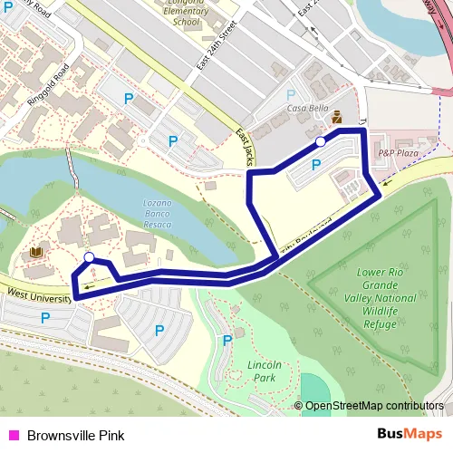 The first stop of the Brownsville Pink bus route is B Main and the last stop is Casa Bella. Brownsville Pink (Brownsville Pink) is operational during todos los días.