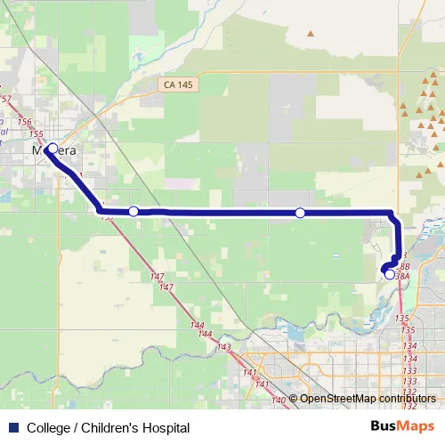 The first stop of the College / Children's Hospital bus route is Intermodal Center/Downtown Madera and the last stop is Children's Hospital. College / Children's Hospital (College / Children's Hospital) is operational during entre semana.