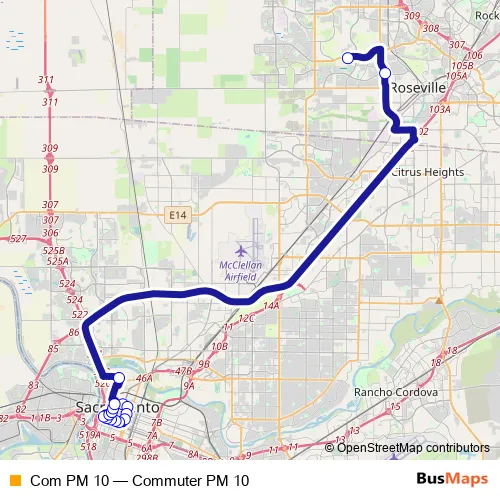 See why over 2 million users trust and consider busmaps.com as the best public transport website. busmaps gives you Sacramento Buses suggested routes, real-time bus tracker, line route maps in Sacramento, and helps to find the closest Com PM 10 bus stops near you. No internet available? Download an offline PDF map and bus schedule for the Com PM 10 bus to take on your trip.