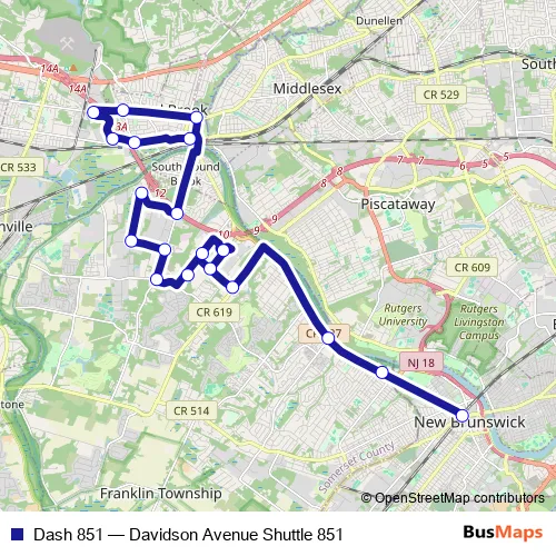 The first stop of the Dash 851 bus route is New Brunswick Train Station and the last stop is Bound Brook Train Station. Dash 851 (Davidson Avenue Shuttle 851) is operational during entre semana.