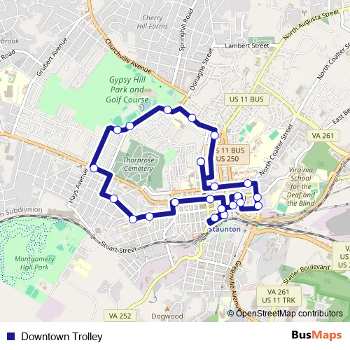 See why over 2 million users trust and consider busmaps.com as the best public transport website. busmaps gives you Staunton Buses suggested routes, real-time bus tracker, line route maps in Staunton, and helps to find the closest Downtown Trolley bus stops near you. No internet available? Download an offline PDF map and bus schedule for the Downtown Trolley bus to take on your trip.