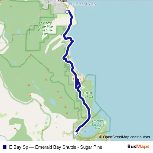 The first stop of the E Bay Sp bus route is Eagle Falls Emerald Bay Trailhead and the last stop is Sugar Pine Point Campground. E Bay Sp (Emerald Bay Shuttle - Sugar Pine) is operational during todos los días.