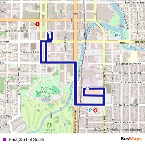 The first stop of the East(35) Lot South bus route is East lot South and the last stop is Lot 6. East(35) Lot South (East(35) Lot South) is operational during entre semana.