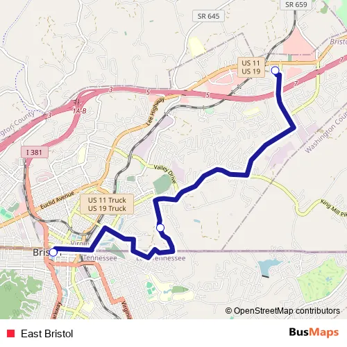 The first stop of the East Bristol bus route is Food City-Bonham Rd and the last stop is Downtown Transfer Center. East Bristol is operational during entre semana.
