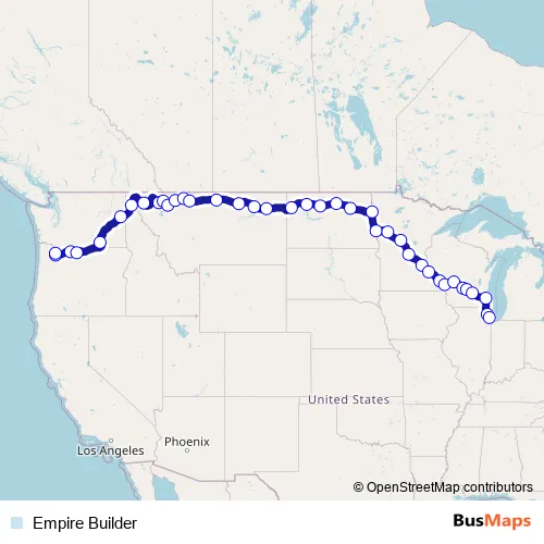 The first stop of the Empire Builder rail route is Portland and the last stop is Chicago Union Station. Empire Builder (Empire Builder) is operational during todos los días.