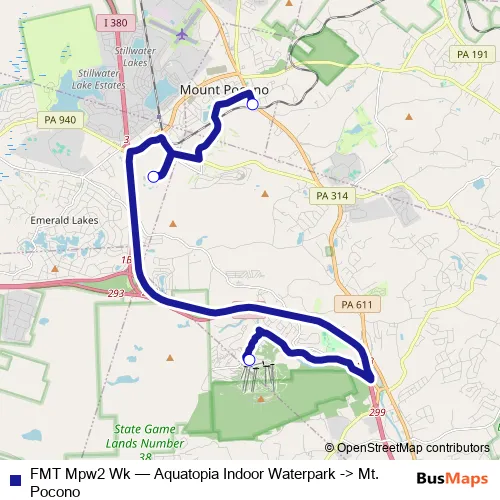 The first stop of the FMT Mpw2 Wk bus route is Aquatopia Indoor Waterpark and the last stop is Mount Pocono. FMT Mpw2 Wk (Aquatopia Indoor Waterpark -> Mt. Pocono) is operational during entre semana.
