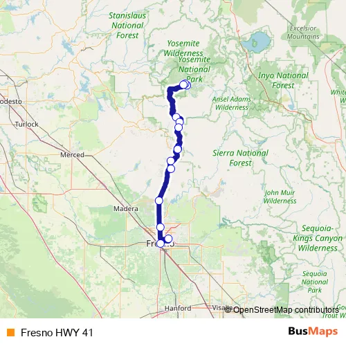See why over 2 million users trust and consider busmaps.com as the best public transport website. busmaps gives you Yosemite Valley Buses suggested routes, real-time bus tracker, line route maps in Yosemite Valley, and helps to find the closest Fresno HWY 41 bus stops near you. No internet available? Download an offline PDF map and bus schedule for the Fresno HWY 41 bus to take on your trip.