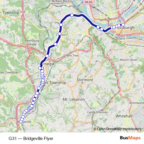 See why over 2 million users trust and consider busmaps.com as the best public transport website. busmaps gives you Pittsburgh Buses suggested routes, real-time bus tracker, line route maps in Pittsburgh, and helps to find the closest G31 bus stops near you. No internet available? Download an offline PDF map and bus schedule for the G31 bus to take on your trip.